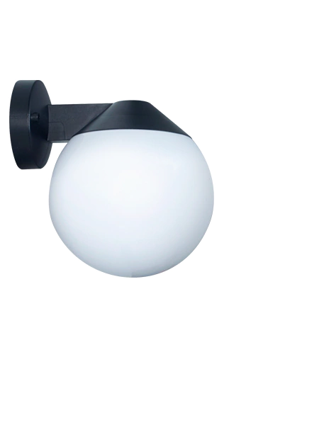 APLIQUE EXTERIOR TIPO GLOBO DE POLICARBONATO PARA ILUMINACIÓN DECORATIVA EN FACHADAS, INGRESOS O GALERÍAS. DISEÑO CLÁSICO Y RESISTENTE, CON DIFUSOR ESFÉRICO EN OPCIÓN OPAL O RAYE.